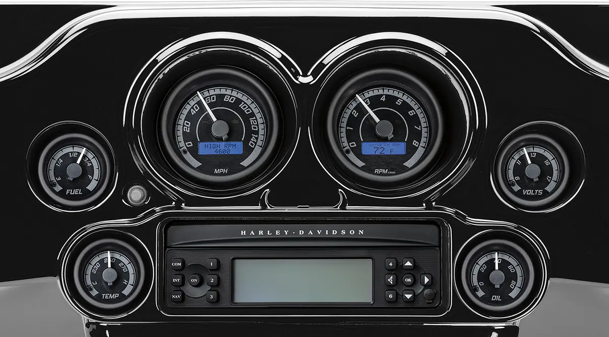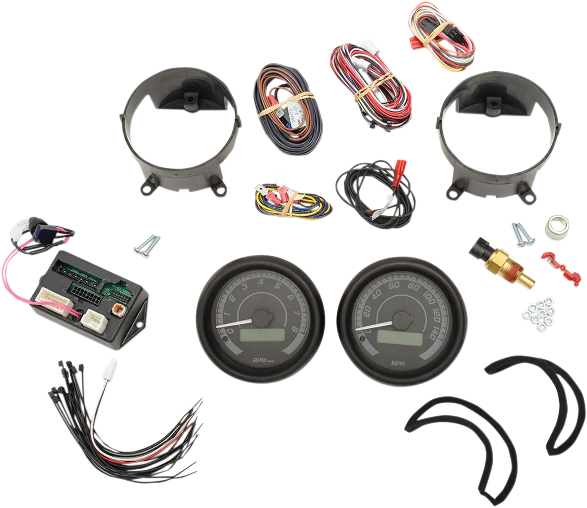 Analog Speedometer, Analog Tachometer, Digital Fuel Gauge, Digital Oil/Pressure Gauge, Digital Oil/Temperature Gauge, Digital Volt Meter, Two-Gauge Kit